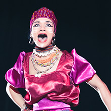 — Это костюм юбочный (есть ещё и брючный). Он состоит из «напопника» (наш вольный перевод), кофточки чоли, на которую через плечо надевается «нагрудник», штанишек, юбки и «веера». «Веер» располагается ниже живота и нарядно раскрывается во время танца, большая часть которого исполняется в позиции «араиманди» — низкий присед.